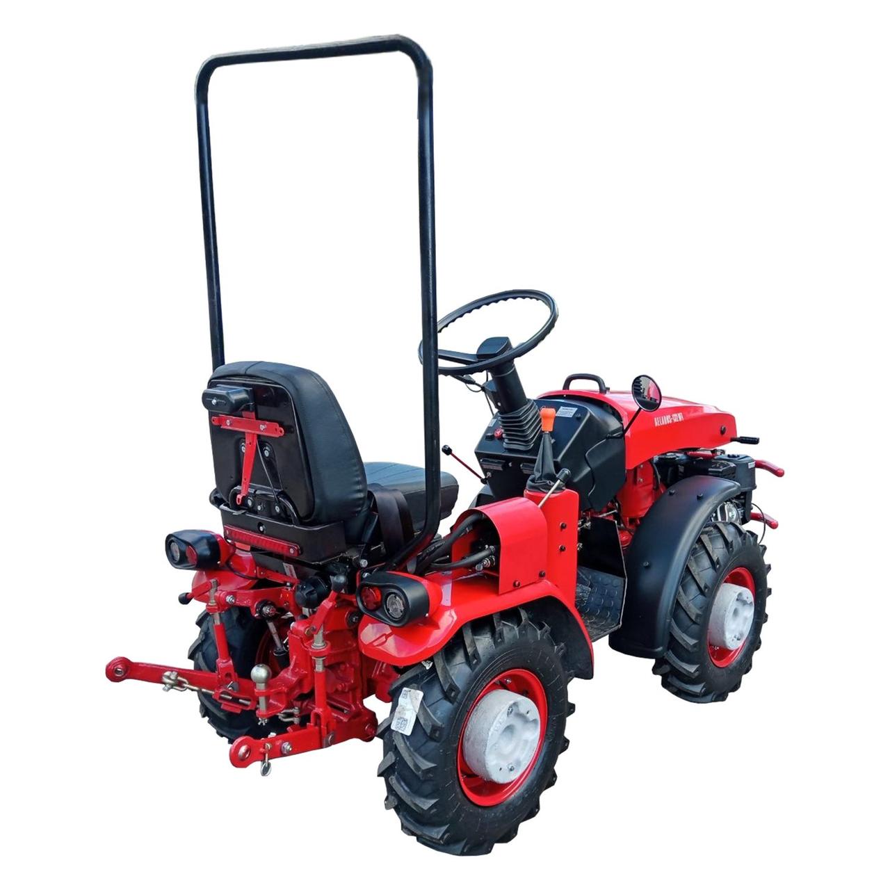 Минитрактор оснащен гидрообъемным управлением с дозирующим насосом и гидравлическим цилиндром в рулевой трапеции.